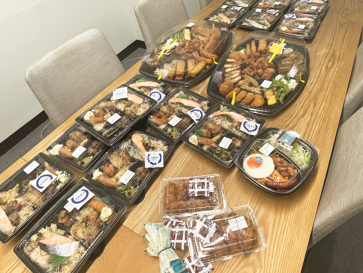 定番の幕の内弁当をはじめ、カレーやオードブルなどさまざまなメニューを用意し、社員全員で美味しくいただきました。