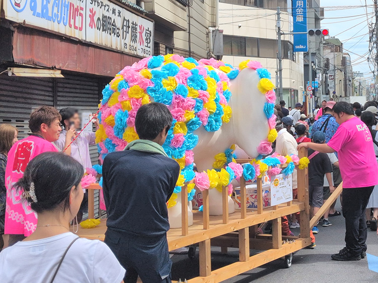 花で飾られた象を山車に乗せて子供たちと町内を引っ張って歩きました。
